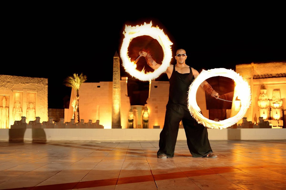 Step into the magnificent Thousand and One Nights Hotel, a tribute to oriental architecture and ancient Egyptian splendor. Amidst pharaonic temples, sphinxes, and grand gates, the open-air theater welcomes up to 2,500 guests for an unforgettable evening of music, light, and storytelling.